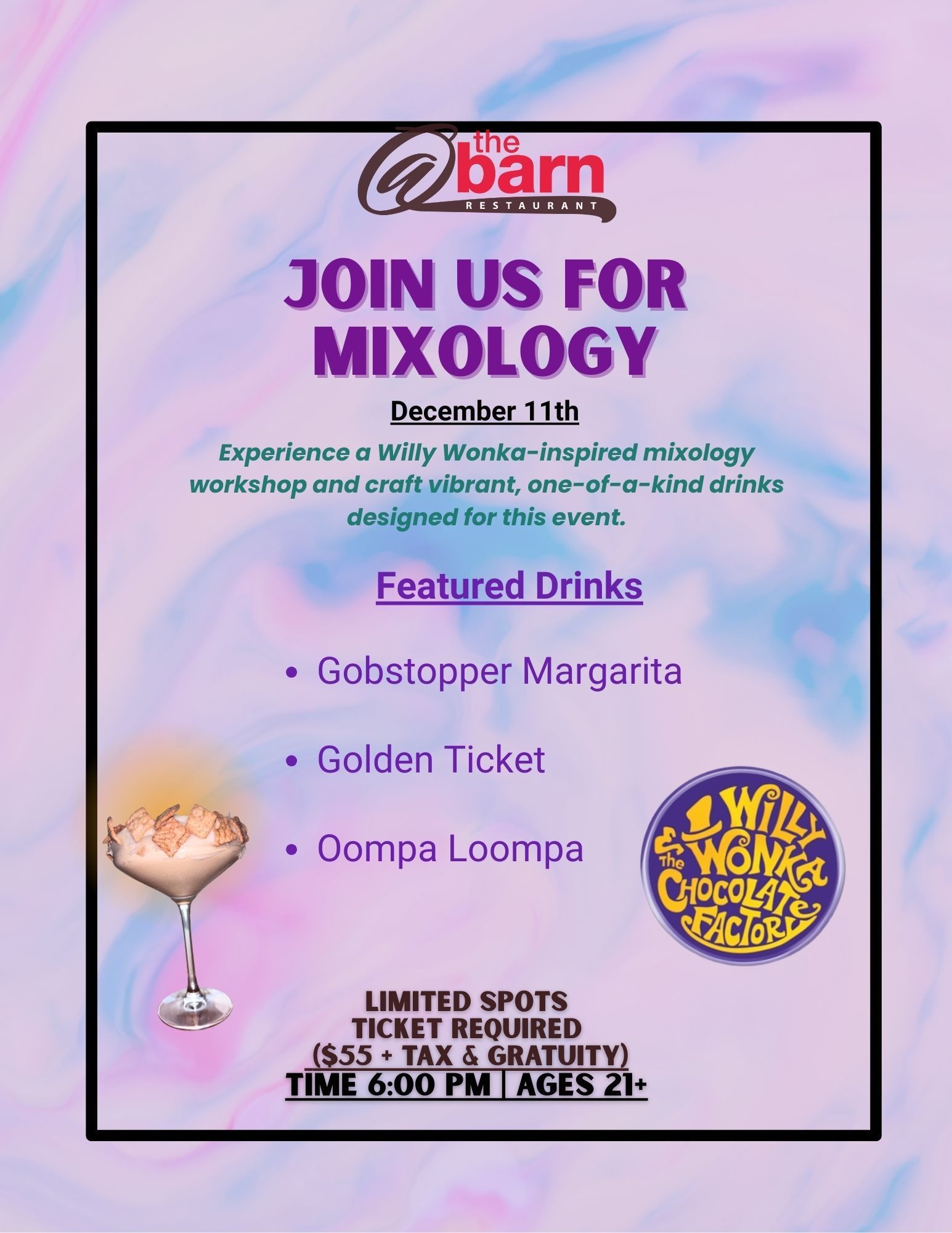 🍸 Willy Wonka–Inspired Mixology Night at The Barn Dec 11th
